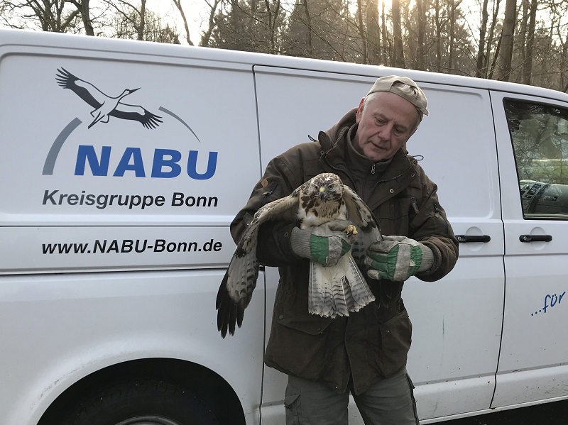 Die geschwollenen Augen des Wanderfalken waren keine Karnevalsverkleidung. Daher wurde der verletzte Vogel am Karnevalssonntag umgehend eingefangen und in die Bergische Greifvogelhilfe gebracht. Nach erfolgter Genesung soll das Tier wieder in Bonn freigelassen werden.