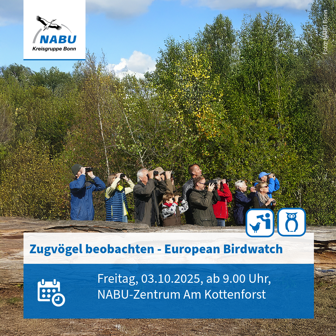 Traditionell schauen wir am 3. Oktober wieder in die Luft. Im Rahmen des European Birdwatch wollen wir gemeinsam am NABU-Zentrum Am Kottenforst den Vogelzug beobachten. Die ersten Zugvögel konnten wir ja bereits in der Region beobachten. In den letzten Jahren konnten wir auch manche Besonderheit mit Spektiv und Fernglas beobachten. Wir freuen uns am 9.00 Uhr auf Ihren Besuch! Je nach Witterung werden wir voraussichtlich bis etwa 14 Uhr vor Ort sein.
