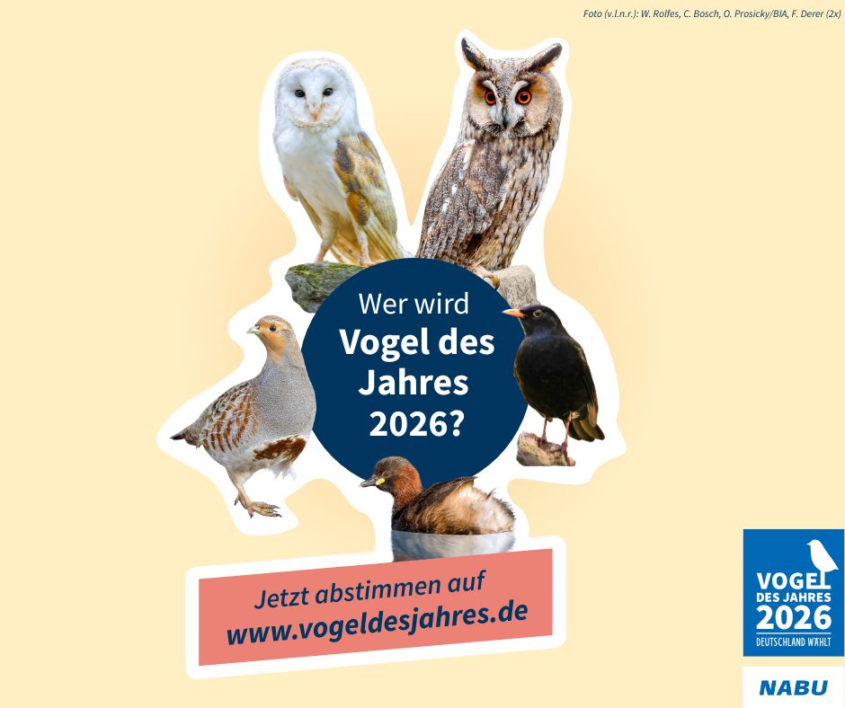 Fünf Kandidaten, eine Stimme, ein Vogel des Jahres 2025! Noch bis zum 10. Oktober könnt ihr eurem Favoriten die Stimme geben. Schwarzstorch, Hausrotschwanz, Schwarzspecht und Waldohreule sind bei uns heimisch. Und ein Besuch vom Kranich ist auch nicht ausgeschlossen.
